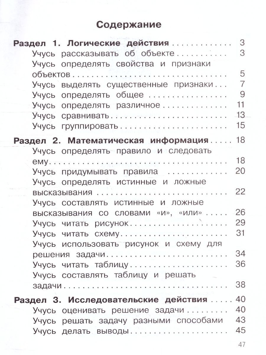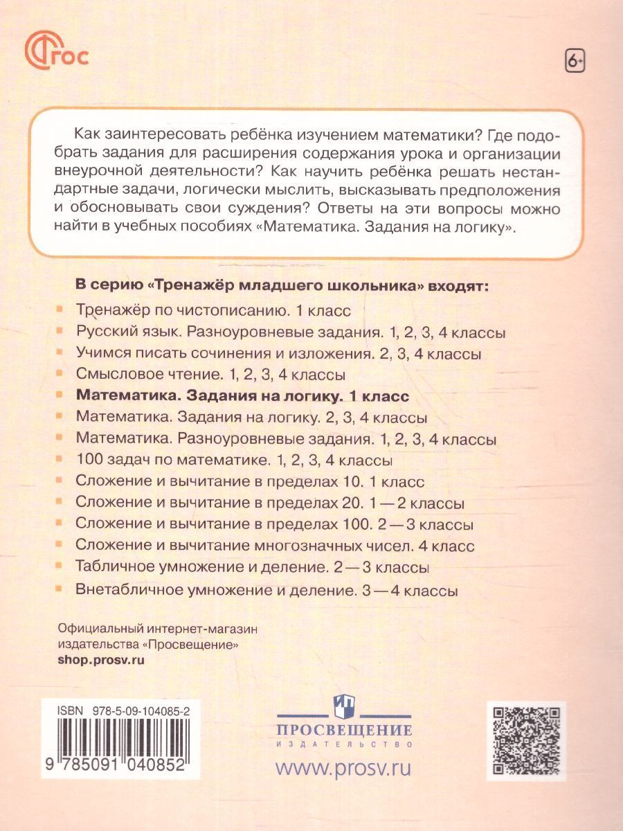 Математика 1 класс. Задания на логику. ФГОС. Учебное пособие "Математика. Задания на логику" соответствует Федеральному государственному образовательному стандарту начального общего образования (Приказ Министерства просвещения РФ № 286 от 31.05.2021 г.). Пособие на-правлено на развитие логического и алгоритмического мышления, метапредметных умений обучающихся. Содержит систему заданий, направленных на овладение разными способами решения логических задач: рассуждение, моделирование с помощью рисунков и схем, составление таблиц и т. д. Пособие предназначено для организации внеурочной деятельности по математике в 1 классе, а также для развития мышления и математических навыков обучающихся в домашних условиях.Характеристики