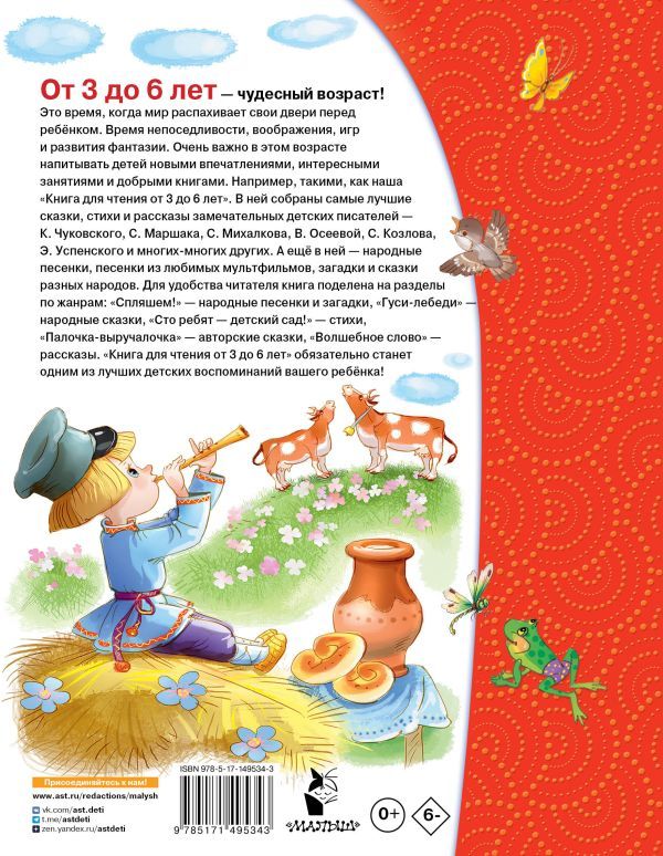 От 3 до 6 лет – чудесный возраст! Это время, когда мир распахивает свои двери перед ребёнком. Время непоседливости, воображения, игр и развития фантазии. Очень важно в этом возрасте напитывать детей новыми впечатлениями, интересными занятиями и добрыми книгами. Например, такими, как наша «Книга для чтения от 3 до 6 лет». В ней собраны самые лучшие сказки, стихи и рассказы замечательных детских писателей – К. Чуковского, С. Маршака, С. Михалкова, В. Осеевой, С. Козлова, Э. Успенского и многих-многих других. А ещё в ней – народные песенки, песенки из любимых мультфильмов, загадки и сказки разных народов. «Книга для чтения от 3 до 6 лет» обязательно станет одним из лучших детских воспоминаний вашего ребёнка!Характеристики