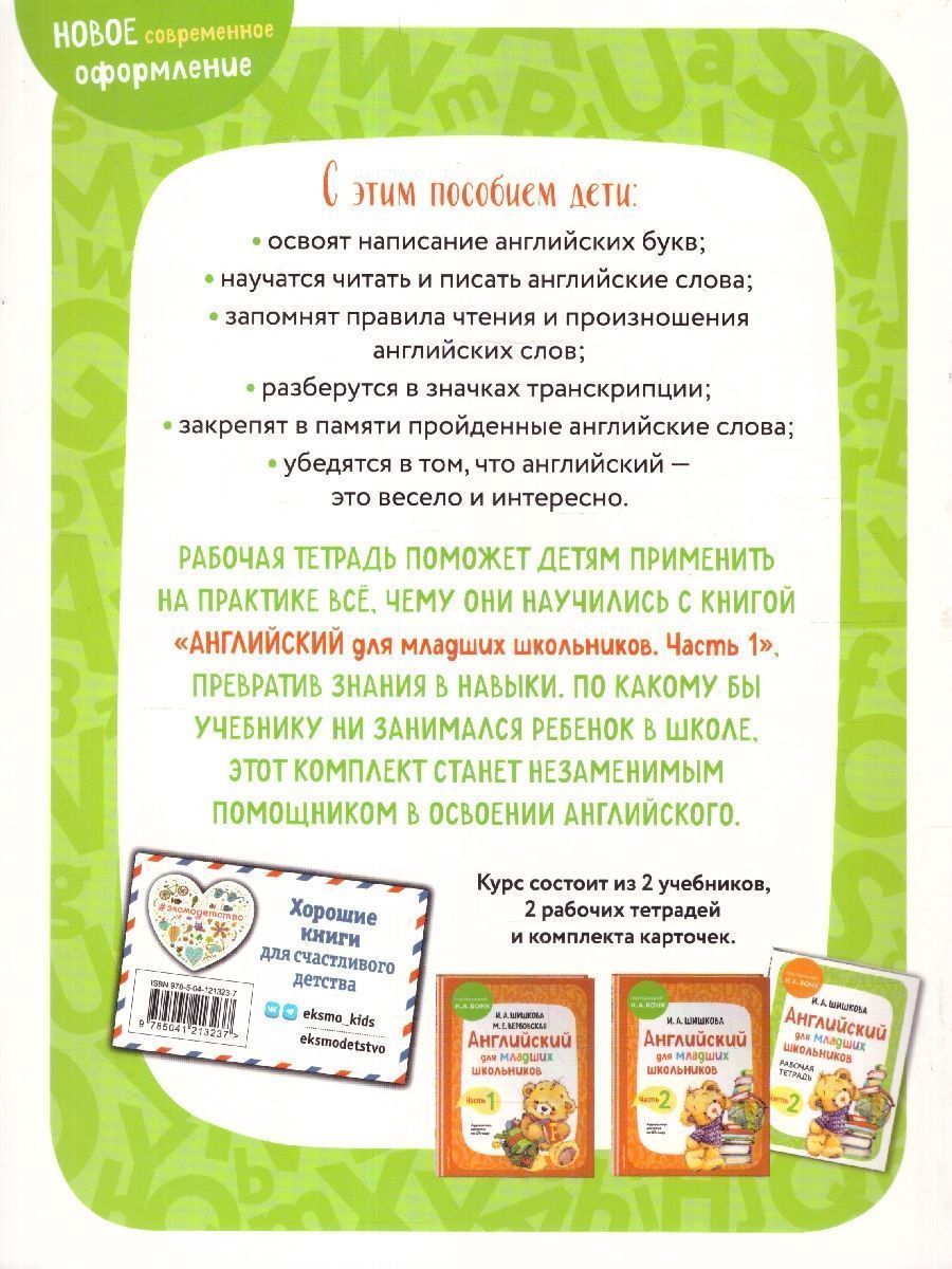 Английский для младших школьников. Рабочая тетрадь. Часть 1. «Английский для младших школьников» – это курс, любимый преподавателями и репетиторами. В нем понятные объяснения в книге дополняются веселыми заданиями, а рабочая тетрадь с ее занимательными упражнениями – реальный способ закрепить материал в памяти. Выполняя задания в рабочей тетради, дети учатся без ошибок читать английские слова, узнавать буквы и понимать знаки транскрипции, писать английские буквы, слова и короткие предложения. Игровые упражнения построены на правилах чтения и произношения и основах грамматики. Выполняя их, дети без зубрежки запоминают все необходимое для того, чтобы начать говорить, читать и писать по-английски. Любимое пособие теперь с забавными современными иллюстрациями!Характеристики