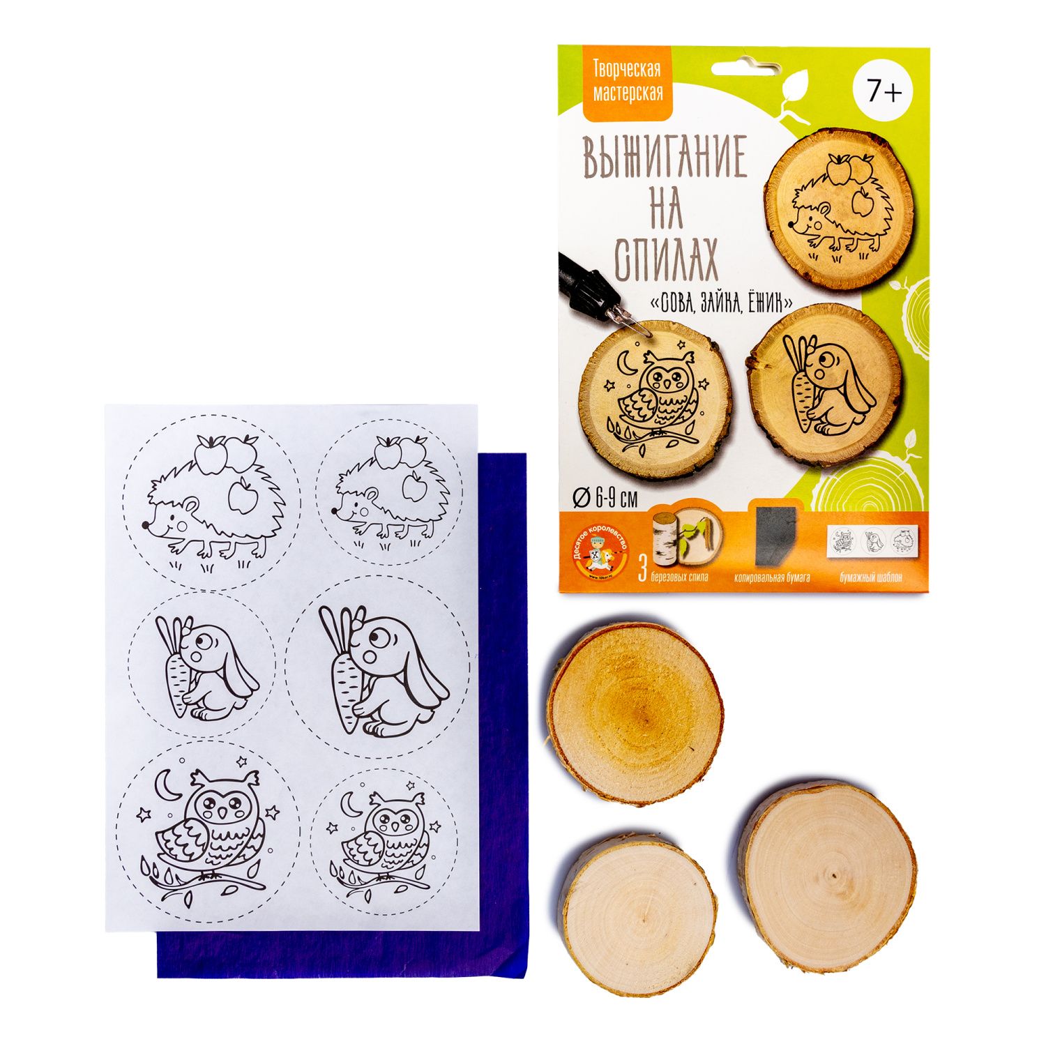 Выжигание на спилах "Сова, Зайка, Ежик" (спил малый)(Десятое королевство)