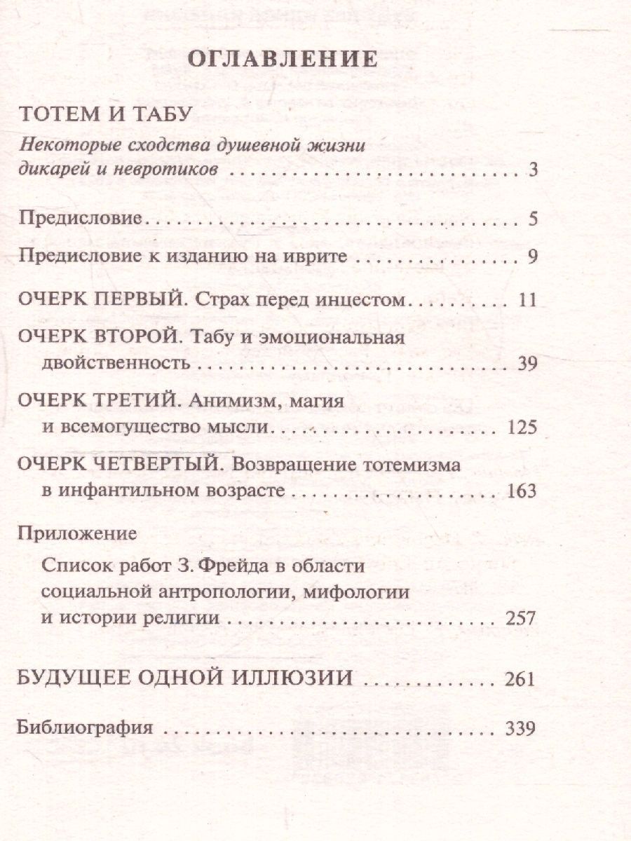 В своей знаковой работе "Тотем и табу" Зигмунд Фрейд на основе трудов виднейших антропологов, этнологов и психологов своего времени, с помощью методологии психоанализа сделал попытку проследить истоки наших страхов, комплексов и морально этических норм, сопоставляя обычаи первобытных племен и социально-нравственные запреты цивилизованного общества. В более поздней статье, "Будущее одной иллюзии", дополнившей этот сборник, он продолжил и развил исследование происхождения различных верований и догм, а также представил свой взгляд на место и будущее религии в социально-культурном контексте. Следует отметить, что "Тотем и табу" представляет не только научную, но и художественную ценность: Томас Манн был восхищен литературными достоинствами этой работы и относил ее к лучшим образцам немецкой эссеистики. Используя эмпирические знания о народах мира, исследования авторитетных антропологов и этнографов, Зигмунд Фрейд исследует корни человеческих догм и верований, доказывая, что наши моральные нормы имеют в своей основе представления о мире первобытного человека. Автор раскрывает тему культурных ограничений и необходимости принуждения к труду, обращаясь к истокам зарождения культуры и религии.Характеристики