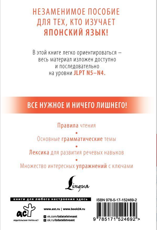 Ольга Андреевна Первова —– преподаватель японских языка и культуры, выпускница МГПУ, опыт преподавания 12 лет. Стажировалась в г. Токио и г. Осака. Пособие "Японский с нуля" состоит из 10 уроков, каждый из которых содержит информацию о необходимых для уровней "JLPT N5—N4" иероглифах и грамматических правилах с примерами их употребления и упражнениями для тренировки навыков. В конце книги вы найдете ключи к этим упражнениям, а также таблицу иероглифических ключей, таблицы азбук катакана и хирагана с порядком начертания и прописи для тренировки правописания иероглифов и азбук. Алфавит, лексика и грамматические конструкции озвучены носителями языка и доступны для бесплатного прослушивания на сайте издательства. Издание адресовано широкому кругу читателей, будет полезно и интересно всем, кто начинает изучать японский язык.Характеристики