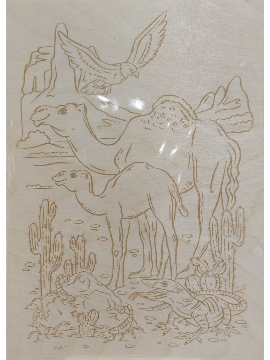 Выжигание по дереву. Доска для выжигания "Пустынный край" формат А4 (европодвес). Доска с рисунком для выжигания «Пустынный край» - это доска формата А4 из берёзовой фанеры с гладкой поверхностью, на которую нанесён контур рисунка. Создайте красивую иллюстрацию на дереве с изображением верблюдов на фоне барханов и подарите ее близкому человеку или украсьте свой интерьер. Выжигание тренирует мелкую моторику, усидчивость, внимательность и кропотливость, а также прививает интерес к ручному искусству. Для детей от 7 лет. Состав набора: • доска для выжигания с нанесённым рисунком – 1 шт. (28,5 х 21 см) Внимание! Выжигательный аппарат не входит в состав набора (приобретается отдельно). Выжигайте по контурам нанесенного рисунка и раскрашивайте рисунок фломастерами, красками или карандашами.Характеристики