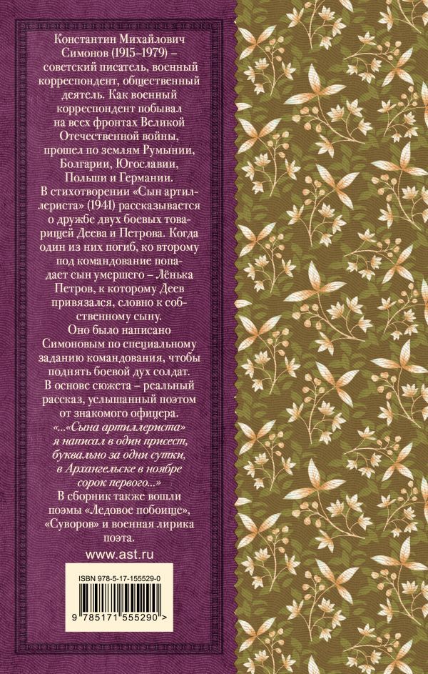 Константин Михайлович Симонов (1915 – 1979) – советский писатель, военный корреспондент, общественный деятель. Как военный корреспондент побывал на всех фронтах Великой Отечественной войны, прошел по землям Румынии, Болгарии, Югославии, Польши и Германии. Поэма "Сын артиллериста" (1941) повествует о дружбе двух боевых товарищей Деева и Петрова. Когда один из них погиб, ко второму под командование попадает сын умершего – Лёнька Петров, к которому Деев привязался, словно к собственному сыну. Поэма была написана Симоновым по специальному заданию командования, с целью поднять боевой дух солдат. В основе сюжета – реальный рассказ, услышанный поэтом у знакомого офицера. "… "Сына артиллериста" я написал в один присест, буквально за одни сутки, в Архангельске в ноябре сорок первого…" В сборник также вошли поэмы "Ледовое побоище", "Суворов" и военная лирика поэта.Характеристики