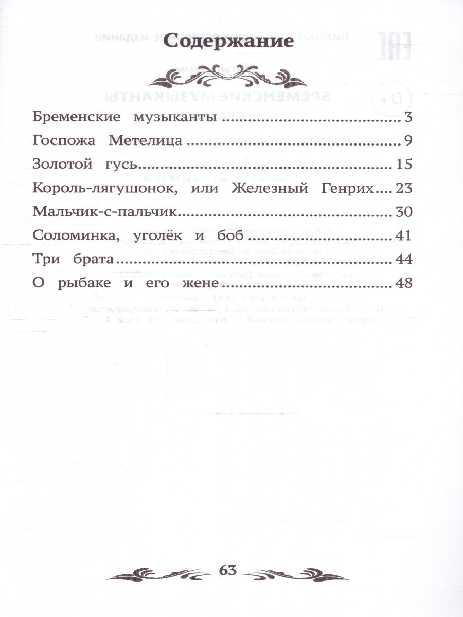 Бременские музыканты. Сказки. Имя сказочников братьев Гримм известно детям и взрослым во всём мире. Однако Якоб и Вильгельм были не только писателями, но и знаменитыми учёными. Они внесли огромный вклад в развитие немецкой литературы и культуры в целом: дали системное описание немецкой грамматики, начали составлять первый словарь немецкого языка (работа над ним продолжалась 120 лет), собрали множество народных сказок и легенд. Братья Гримм родились в городе Ханау, в семье адвоката. Якоб Гримм появился на свет в 1785 году, а Вильгельм - годом позже; у них было шесть младших братьев и сестра. Чтобы обеспечить детей всем необходимым, отцу семейства приходилось работать на износ, не зная отдыха. Он рано ушёл из жизни: организм не справился с воспалением лёгких. Мать мальчиков прекрасно видела, как любознательны и усердны её старшие сыновья, а потому, несмотря на финансовые трудности, отправила их учиться в лицей. Братья прошли полный курс обучения за 4 года (вдвое быстрее положенного) и поступили на юридическое отделение Марбургского университета. Там они увлеклись художественной литературой и недолгие свободные часы посвящали изучению немецкой поэзии. Позже братья Гримм начали собирать и изучать сказки немецкого народа. Для младшего школьного возраста. Тексты произведений приводятся без сокращений.Характеристики