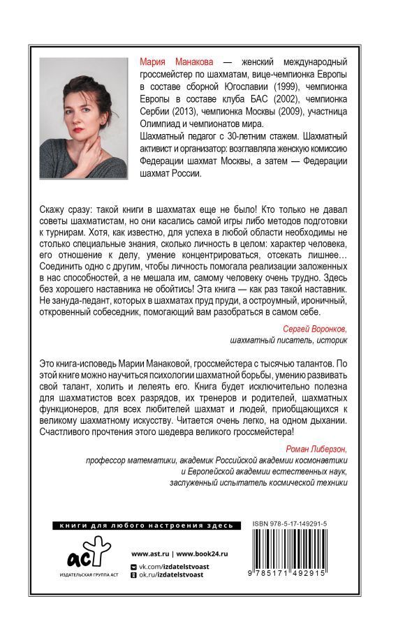 Книга международного гроссмейстера Марии Манаковой охватывает все психологические аспекты шахматной борьбы: подготовку к турниру и поведение во время турнира, распределение энергии, преодоление страхов и комплексов, контроль времени, восстановление психологического равновесия после поражения. Книга написана живо и остроумно, без занудства и педантизма, которыми часто грешат шахматные пособия. Акцент сделан не на специальные знания и разбор партий, а на развитие личности в целом. Шахматы с древнейших времен считались моделью любой борьбы за победу, «зеркалом жизни», поэтому каждый человек, даже не шахматист, найдет в книге много полезных советов. Мария Манакова — международный гроссмейстер, чемпионка Москвы, чемпионка Европы. Шахматный педагог с 30-летним стажем. Активист и организатор: возглавляла женскую комиссию Федерации шахмат Москвы, а затем Федерации шахмат России.Характеристики