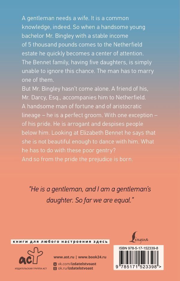 Гордость не позволяет вам читать английские книги в адаптации? Предубеждены против сокращений? Тогда ознакомьтесь с шедевром Джейн Остен в оригинале! «Гордость и предубеждение» — роман нравов, рассказывающий о неравной любви аристократа и девушки из семьи небогатого дворянина, которому отчаянно необходимо пристроить куда-нибудь пять своих дочерей. Эта история любви вот уже два столетия находит себе преданных поклонников. Впрочем, не последнюю роль в этом играет мягкий юмор Д. Остен, её неповторимая авторская черта. Джейн Остен — одна из первых английских писательниц и по значению, и по хронологии. Слог её изящен и ироничен. Хотя она росла в том же мире сословных предрассудков конца XIX в., что и её герои, она легко возносится над ним. Облик этого общества, сатира над которым начинается буквально с первого предложения романа, Д. Остен выписала тщательно и с большой любовью. Сюжет книги не так уж сложен, но это с лихвой восполняет её мастерское владение стилем. Книга издана в неадаптированной версии. Наслаждайтесь английским языком в оригинале!Характеристики