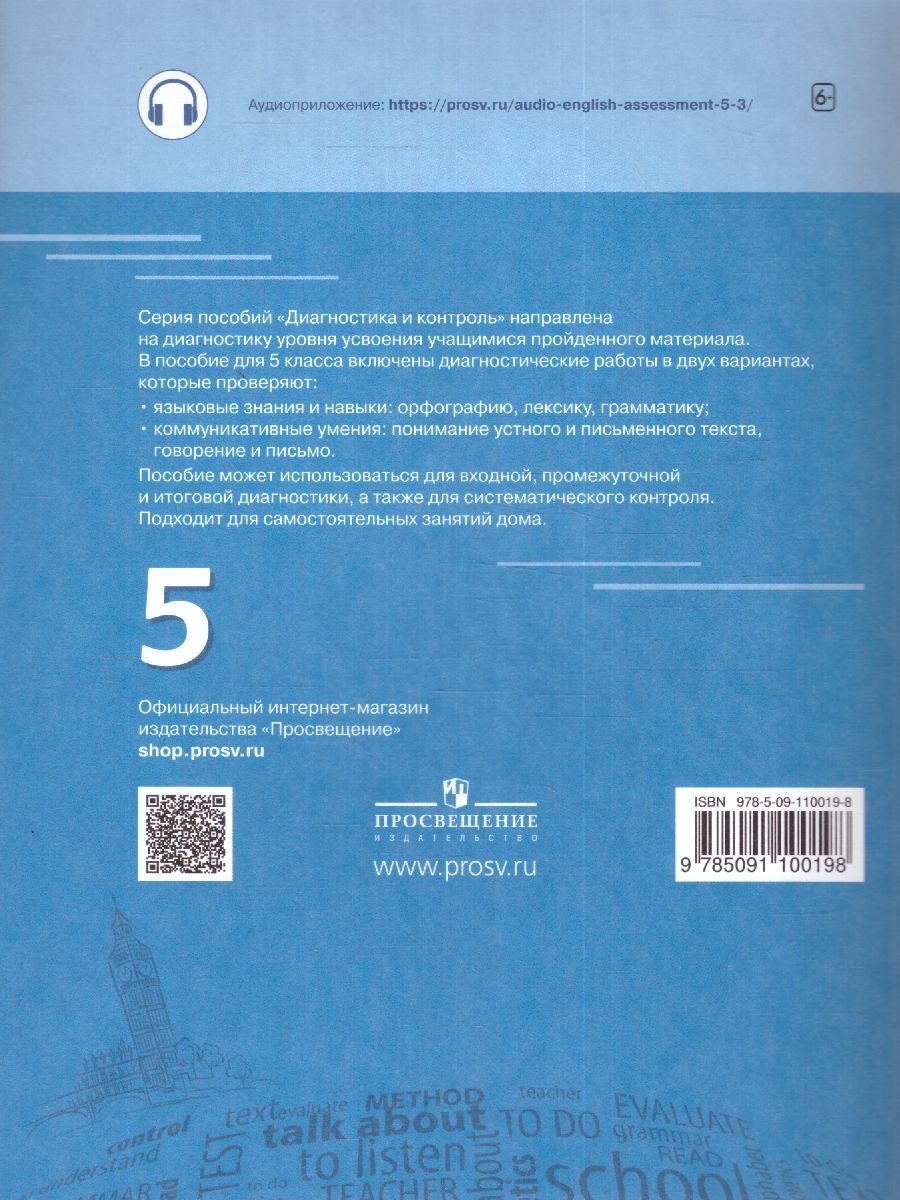 Издание предназначено для мониторинга сформированности образовательных результатов обучающихся 5 класса и для проведения диагностических работ на уроках контроля в процессе обучения английскому языку. Пособие содержит тематические диагностические работы в двух вариантах базового уровня сложности. Каждая работа включает задания по аудированию, чтению, лексике, грамматике и письменной речи. Содержание пособия разработано в строгом соответствии с Федеральной основной образовательной программой (ФООП) основного общего образования и направлено на объективную оценку предметных и метапредметных результатов обучающихся 5 класса в рамках тематического содержания речи. Пособие может использоваться в школе для входной, промежуточной и итоговой диагностики, для систематического тематического контроля усвоения изученного материала, для подготовки к региональным оценочным процедурам, к ВПР, ОГЭ и ЕГЭ, а также дома самостоятельно.Характеристики