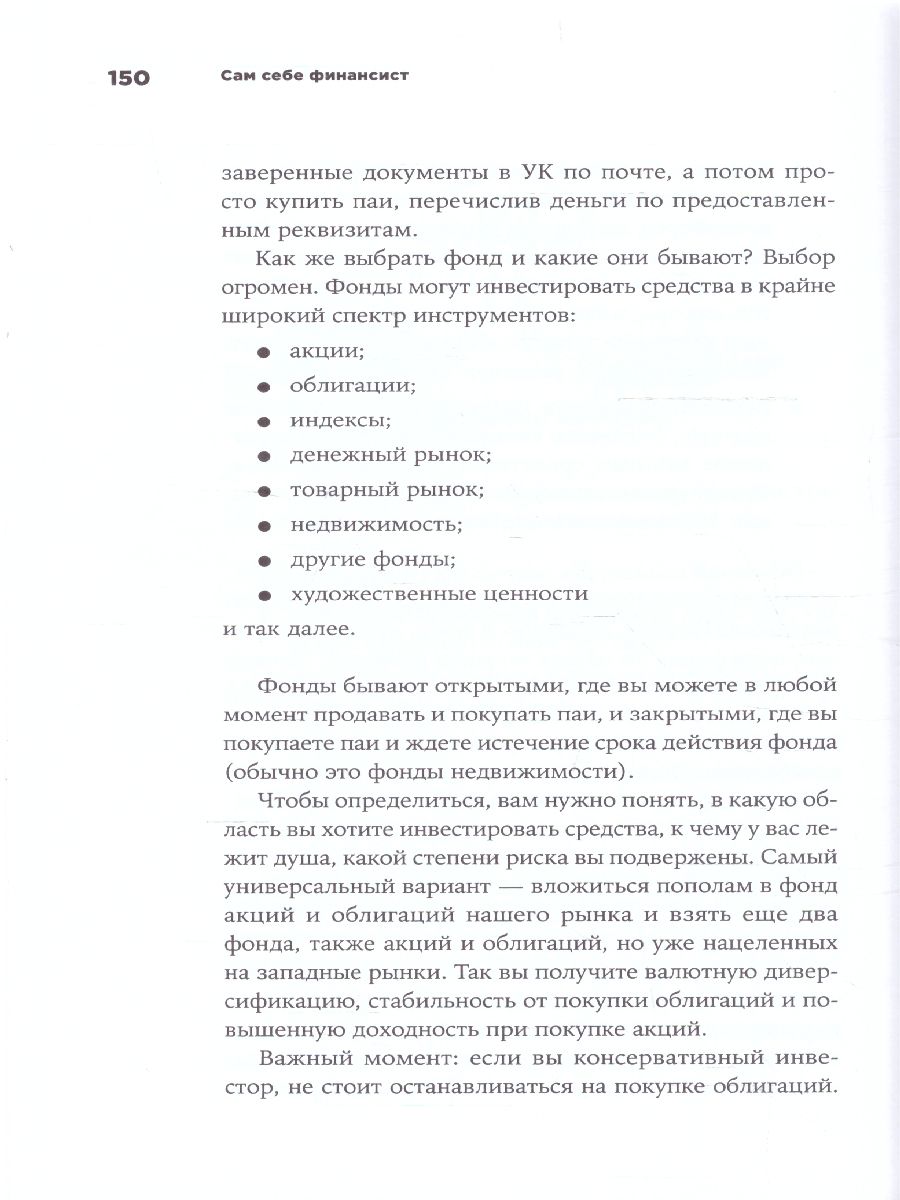 Никто не позаботится о нашем благополучии кроме нас самих. На нашей невнимательности и финансовой безграмотности умные люди делают состояния. Анастасия Тарасова предлагает взять ситуацию в свои руки. Она предлагает стремиться к тому, чтобы и сберечь заработанное, и с комфортом вести приятную жизнь. «Надо не тратить меньше, а зарабатывать больше!» — так звучит народная мудрость, с которой согласятся многие. В своей книге «Сам себе финансист» Анастасия доходчиво рассказывает, как привести свои финансовые дела в порядок и подружиться с деньгами. «Когда моему сыну было 9 месяцев, я сидела в декрете, муж остался без работы. Мы жили на съёмной квартире, долгов было полно, а денег в заначке — не очень-то. Тогда я поняла, что нужно с чего-то начать. И стала записывать, на что трачу деньги. Довольно быстро выяснилось, что около 30% дохода уходит на непонятную ерунду. 30% ежемесячно. То есть каждые три месяца мы выкидывали в мусор одну месячную зарплату. За год — четыре зарплаты! Хорошо помню момент, когда я это осознала». В книге собраны практические советы и решения по управлению личными финансами, как без ущерба оптимизировать свой бюджет, инвестировать с умом, формировать свою пенсию и работать со своими активами и пассивами. «Сам себе финансист» состоит из жизненных примеров, а её автор убежден — любой человек способен улучшить своё благосостояние. «Даже если вы потом закроете эту книгу и отправите её на дальнюю полку, ваш мозг продолжит работать над идеями из неё. Даже когда вы спите. Даже когда вы совершенно не думаете о финансах. Мне вот, например, лучшие идеи приходят, когда я принимаю душ». Вы узнаете: Как вести домашний бюджет (позволит сэкономить до 30% ваших трат). Как сформировать свою пенсию самостоятельно. Как оптимизировать доходы и расходы.Как правильно управлять пассивами и активами и вообще что это такое. Как начать платить по кредитам заметно меньше прямо сейчас. «Я не за экономию, а за поиск баланса между комфортной жизнью в настоящем и формированием капитала на будущее. Я за то, чтобы не прыгать выше головы, а ставить цели и идти к ним. Я за понимание направления движения денег. Ведь отсутствие этого понимания — прямой шаг к бедности: не сегодня, так завтра». Зачем читать? Чтобы научиться оптимизировать бюджет. Получать практическую выгоду уже через 2-3 месяца. Воспользоваться специально созданной таблицей Excel, которая поможет в управлении финансами. Чтобы научиться определять свои пассивы и активы и управлять ими. Научиться разбираться в инвестировании. Обеспечить стабильное будущее себе и своим детям. Для кого? Благодаря очень простому языку и доходчивым, жизненным примерам эта книга поможет привести в порядок свои финансы людям с самыми разными доходами.Характеристики