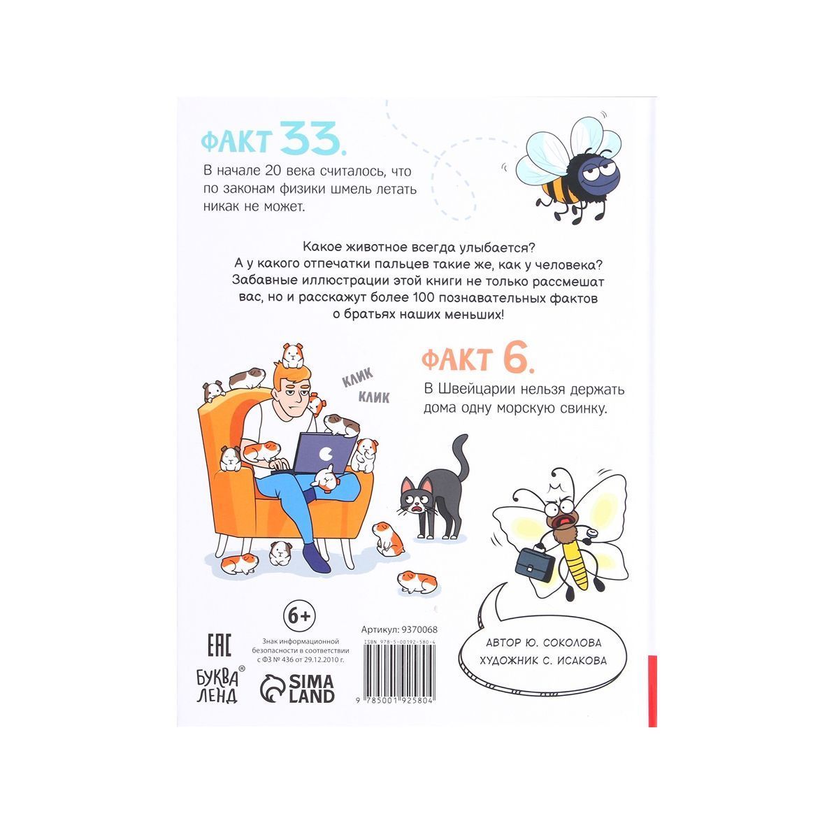 Энциклопедия «Забавные факты о животных» поможет расширить кругозор ребёнка и ответить на самые необычные вопросы. К примеру: какое животное всегда улыбается? а у какого отпечатки пальцев такие же, как у человека? Забавные иллюстрации этой книги не только рассмешат вас, но и расскажут более 100 познавательных фактов о братьях наших меньших! Несколько фактов о зверьках Выдра. Сталкиваясь с угрозой, выдры показывают нападающему своих детёнышей, чтобы вызвать сострадание. Квокка. Мордочка этого зверька выглядит так, будто зверёк всегда улыбается. Капибара. Этот зверь считается самым дружелюбным на планете Земля. Он способен поладить с любым живым существом другого вида. Морская свинка. В Швейцарии нельзя держать в качестве питомца только одну морскую свинку, т. к. эти животные стайные, им нужны приятели-сородичи. Особенности книги Твёрдый переплёт. Размер: 17 × 22,5 см. В книге 48 страниц. Внутри вы найдёте 100 забавных фактов о животных нашей планеты. Рекомендована для детей от 6 лет.Характеристики