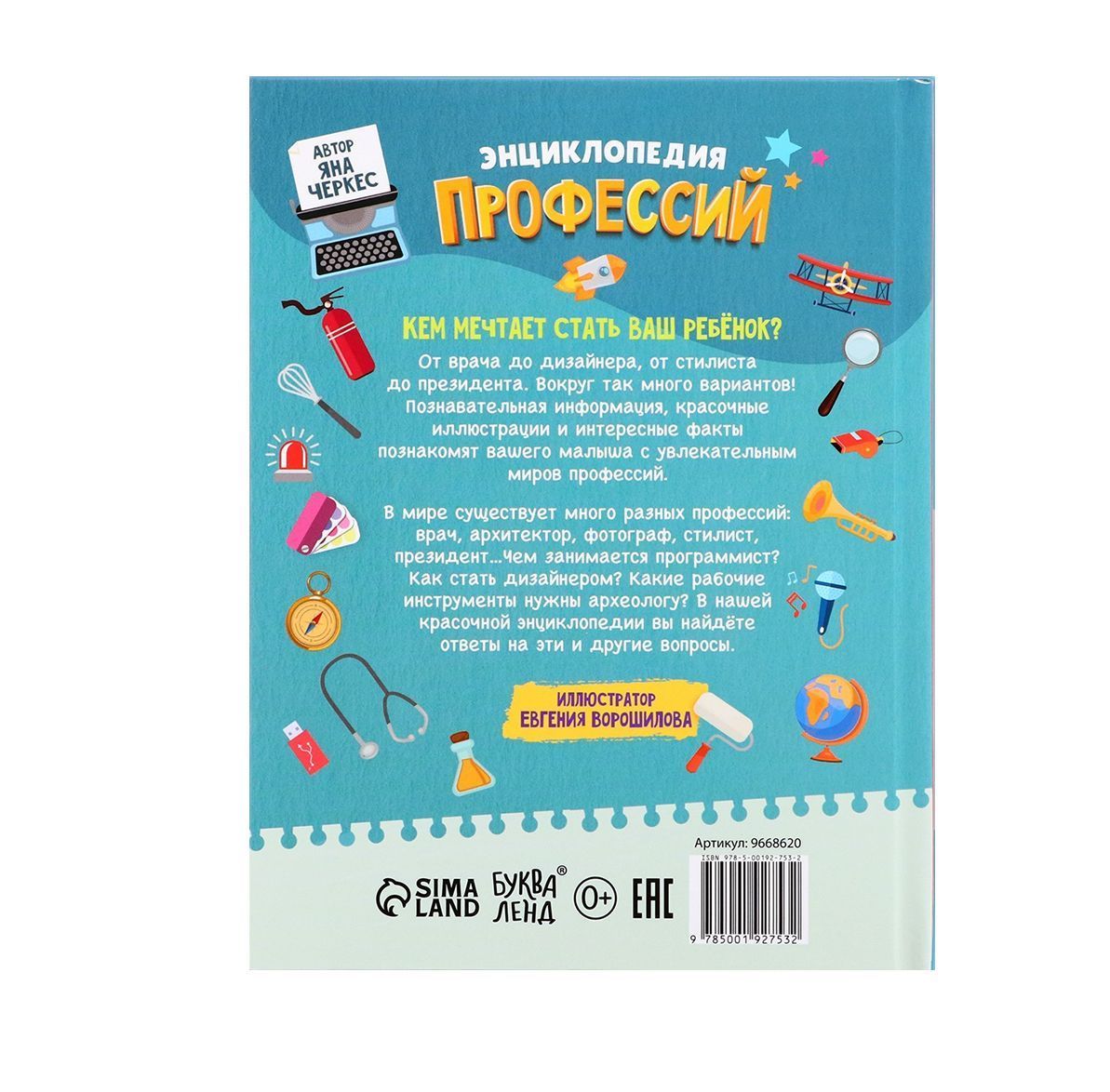 Кем мечтает стать ваш ребёнок? От врача до дизайнера, от стилиста до президента — вокруг так много вариантов! Познавательная информация, красочные иллюстрации и интересные факты познакомят вашего малыша с увлекательным миром профессий. Чем занимается программист? Как стать дизайнером? Какие рабочие инструменты нужны археологу? В нашей красочной энциклопедии вы найдёте ответы на эти и другие интересные вопросы. Особенности книги В книге описаны 22 профессии. У книги твёрдый переплёт, 48 страниц. Размер книги: 17 × 22,3 см. Рекомендовано для детей от 5 лет.Характеристики