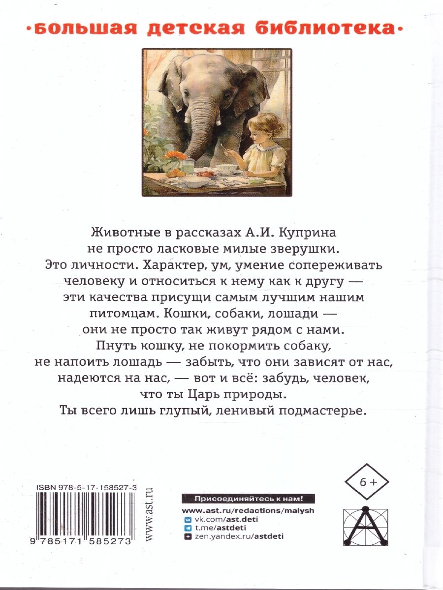 Слон. Рассказы. Большая детская библиотека. В книгу вошли рассказы А.И. Куприна про животных ("Белый пудель", "Ю-ю", "Завирайка, "Слон" и др.) и про детей ("Тапёр", "Храбрые беглецы", "Сашка и Яшка", "Бедный принц" и др.). Дети в рассказах Куприна часто несчастливы, потому что их обижают взрослые. Но если найдётся человек, который отнесётся к ним с сочувствием — с какой любовью откликнется детское сердце! Для среднего школьного возраста.Характеристики