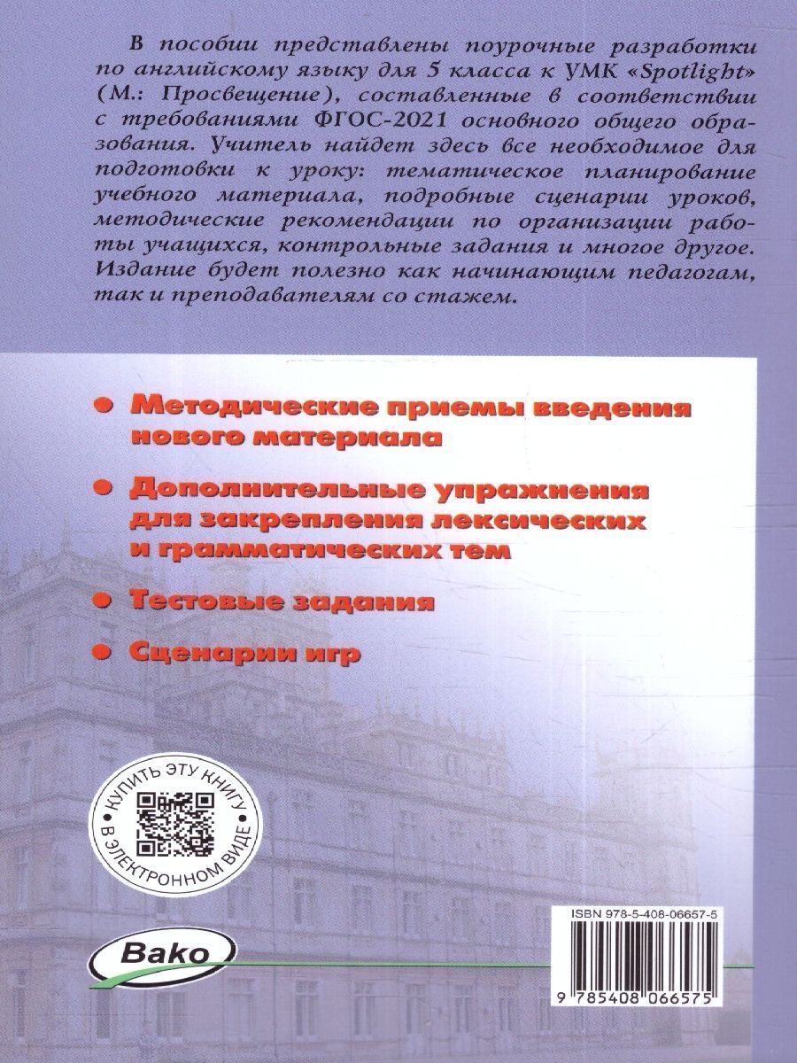 Английский язык 5 класс. Поурочные разработки. К УМК Ю.Е.Ваулиной (Spotlight.Английский в фокусе). Новый ФГОС. Поурочные методические разработки составлены по учебнику Ю. Е. Ваулиной, Дж. Дули и др. "Английский в фокусе" / "Spotlight" (М.: Express Publishing: Просвещение), входящему в действующий федеральный перечень учебников (приказ Минпросвещения России от 21.09.2022 № 858). Материал соответствует требованиям ФГОС-2021 и ФОП ООО (приказ Минпросвещения России от 18.05.2023 № 370). Учитель найдет здесь все необходимое для подготовки к уроку: тематическое планирование учебного материала, подробные сценарии уроков, методические рекомендации по организации работы учащихся, контрольные задания и многое другое. Издание адресовано преподавателям английского языка, студентам педагогических вузов и колледжей.Характеристики