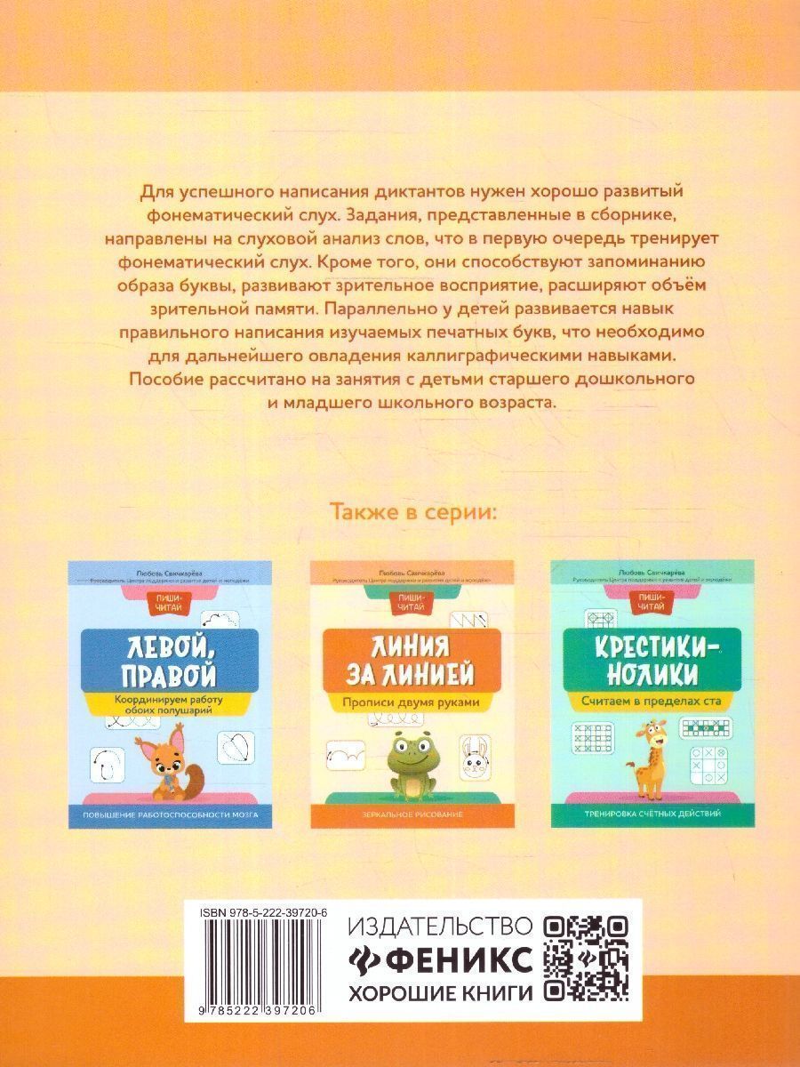 Для успешного написания диктантов нужен хорошо развитый фонематический слух. Задания, представленные в сборнике, направлены на слуховой анализ слов, что в первую очередь тренирует фонематический слух. Кроме того, они способствуют запоминанию образа буквы, развивают зрительное восприятие, расширяют объем зрительной памяти. Параллельно у детей развивается навык правильного написания изучаемых печатных букв, что необходимо для дальнейшего овладения каллиграфическими навыками. Пособие рассчитано на занятия с детьми старшего дошкольного и младшего школьного возраста.Характеристики