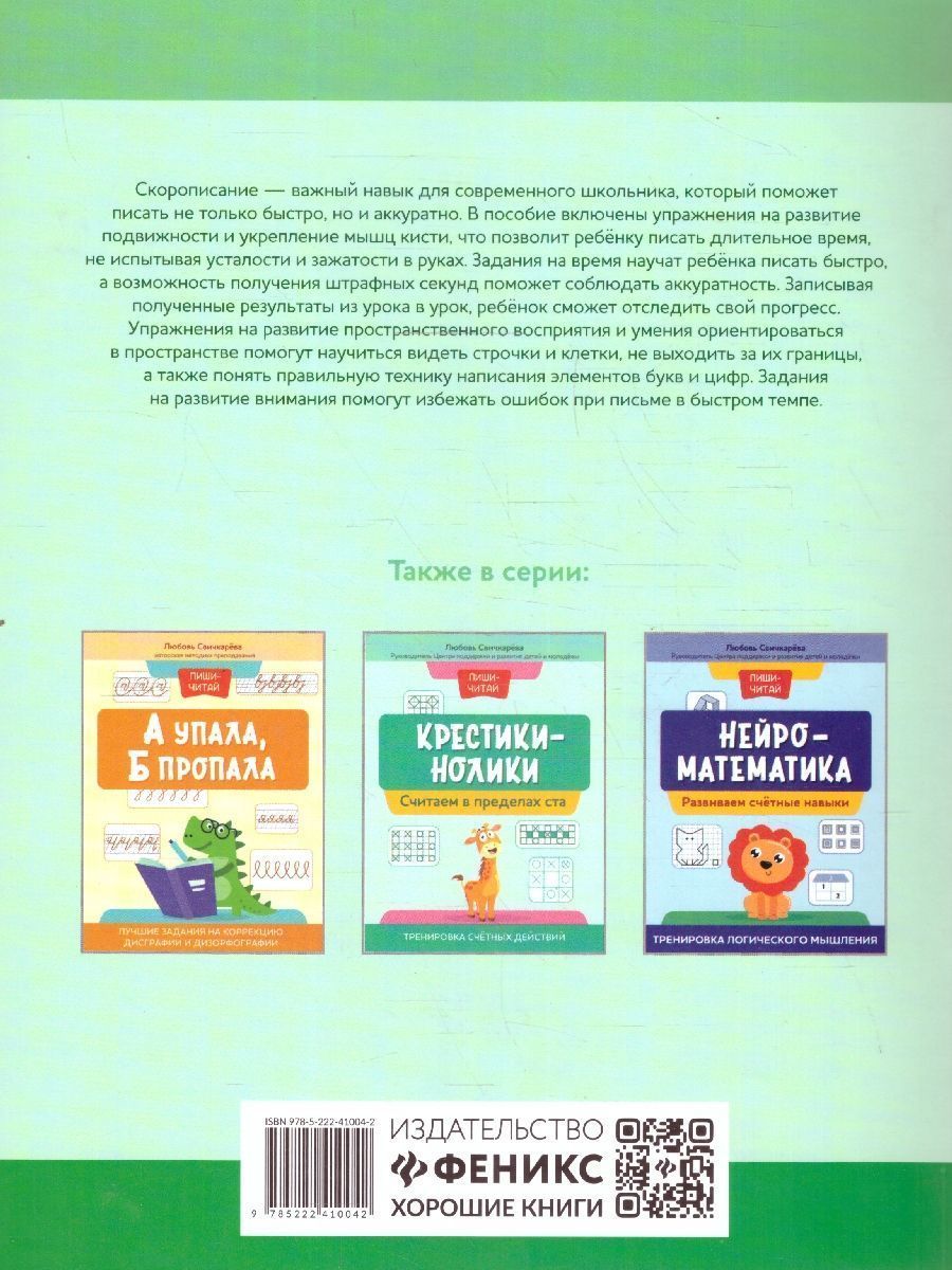 Нейрописьмо. Развиваем навыки скорописания. Тренировка аккуратности и моторики. Скорописание - важный навык для современных школьников, который поможет писать не только быстро, но и аккуратно. В пособие включены упражнения на развитие подвижности и укрепление мышц кисти, что позволит ребёнку писать длительное время, не испытывая усталости и зажатости в руках. Задания на время научат ребёнка писать быстро, а возможность получения штрафных секунд поможет соблюдать аккуратность. Записывая полученные результаты из урока в урок, ребёнок сможет отследить свой прогресс. Упражнения на развитие пространственного восприятия и умения ориентироваться в пространстве помогут научиться видеть строчки и клетки, не выходить за их границы, а также понять правильную технику написания элементов букв и цифр. Задания на развитие внимания помогут избежать ошибок при письме в быстром темпе.Характеристики