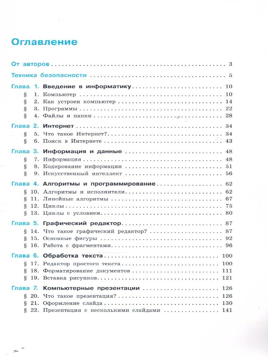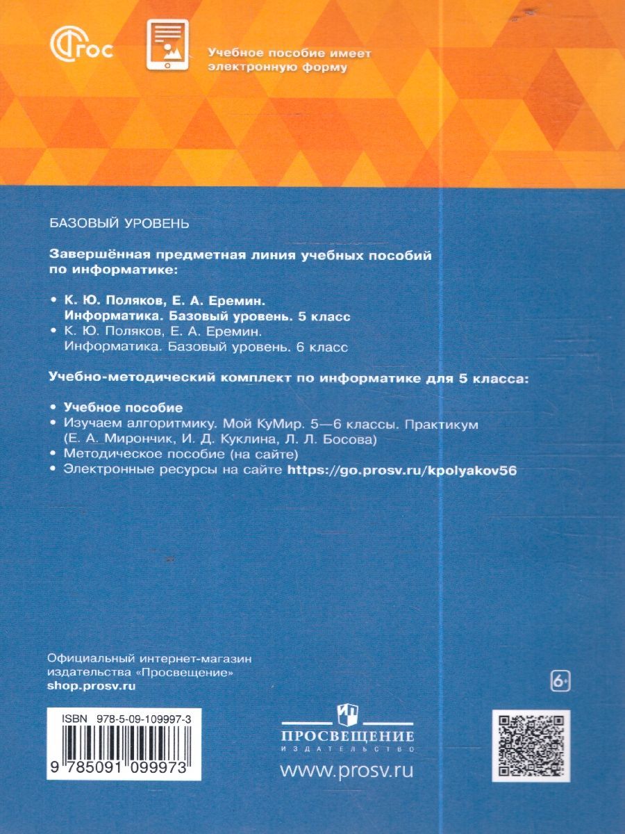 Информатика 5 класс. Учебное пособие. Учебное пособие представляет собой вводный курс информатики для 5 класса. В первых главах учебника рассмотрено устройство компьютера, правила работы в сети Интернет, основные информационные процессы и возможности искусственного интеллекта. В главе «Алгоритмы и программирование» учащиеся познакомятся с принципами управления исполнителями в среде блочного программирования. Последние главы посвящены информационным технологиям: обработке изображений и текста, созданию презентаций. Практические занятия рассчитаны на использование компьютеров. Учебное пособие соответствует Примерной рабочей программе основ- ного общего образования по предмету «Информатика» (базовый уровень, для 5–6 классов образовательных организаций).Характеристики