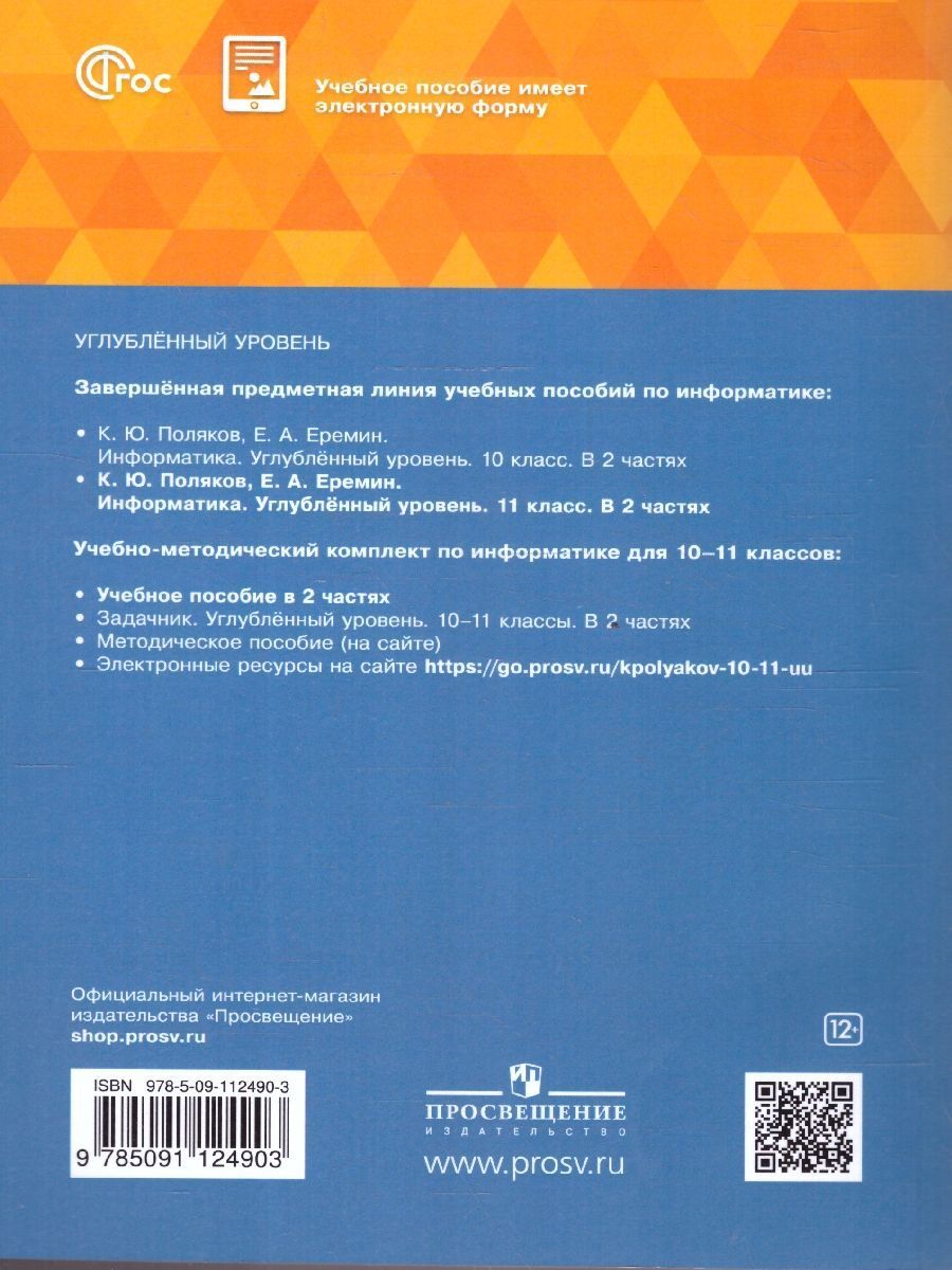 Информатика 11 класс. Углубленный уровень. Комплект в 2 частях. Учебное пособие. УМК "Информатика. Поляков К.Ю., Еремин Е.А. (10-11) (Углублённый)". ФГОС. Учебное пособие предназначено для изучения информатики на углублённом уровне в 11 классах общеобразовательных организаций. Содержание является продолжением курса 10 класса и опирается на изученный в 7–9 классах курс информатики для основной школы. Во второй части учебника рассматриваются работа с базами данных, разработка веб-сайтов, компьютерная графика и 3D-моделирование.Характеристики