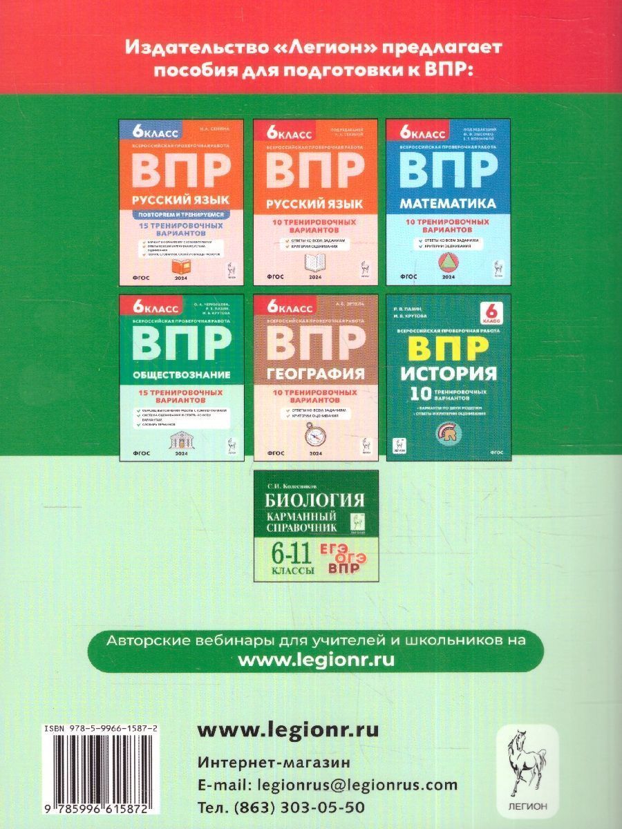 Пособие содержит материал, необходимый для подготовки к все российской проверочной работе по биологии в 6-м классе: - подробное описание работы и систему оценивания; - 10 авторских тренировочных вариантов, составленных по образцу и описанию ВПР, опубликованным на сайте ФИОКО; - развёрнутые ответы ко всем вариантам. Пособие будет полезно учителям, учащимся 6-х классов и их родителям.Характеристики