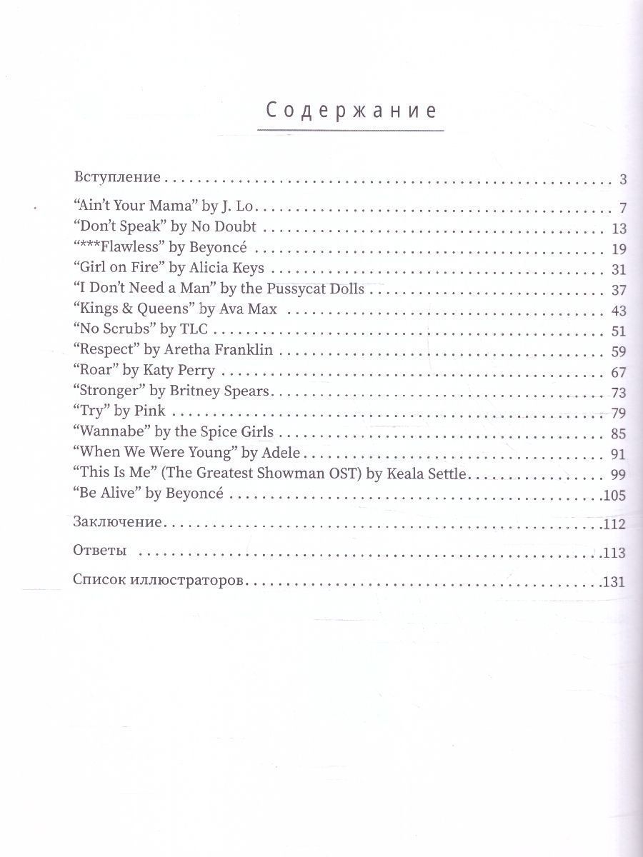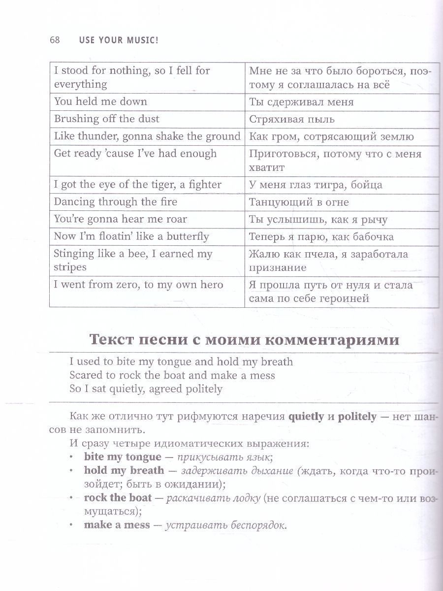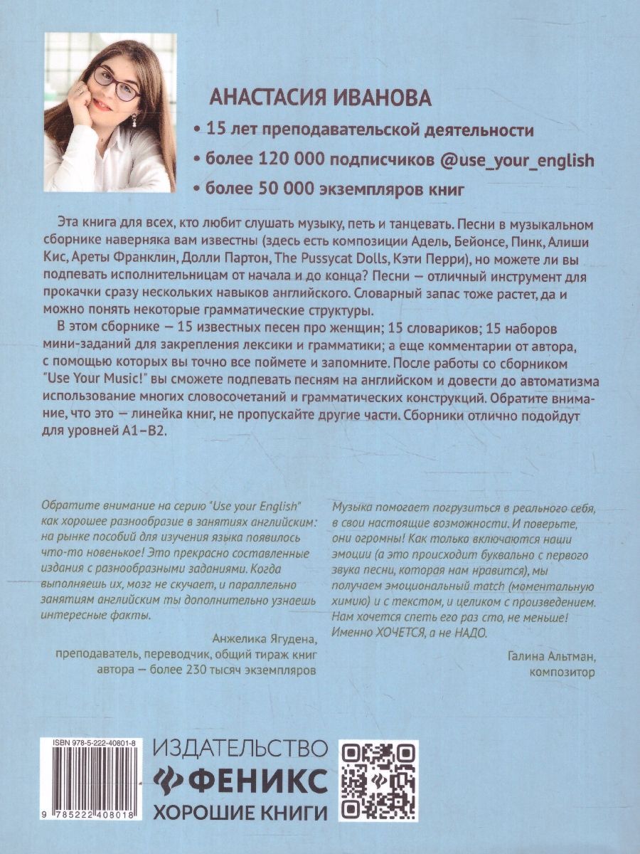 Эта книга для всех, кто любит слушать музыку, петь и танцевать. Песни в данном сборнике наверняка вам известны. Здесь есть композиции Адель, Бейонсе, Пинк, Алиши Киз, Ареты Франклин, Долли Партон, The Pussycat Dolls, Кэти Перри. Но можете ли вы подпевать исполнительницам от начала и до конца? Песни - отличный инструмент для прокачки сразу нескольких навыков английского. Словарный запас тоже растет, да и можно понять некоторые грамматические структуры. В этом сборнике 15 известных песен про женщин; 15 словариков; 15 наборов мини-заданий для закрепления лексики и грамматики; комментарии от автора, с помощью которых у вас точно получится всё понять и запомнить. После работы со сборником Use Your Music! вы сможете подпевать песням на английском и довести до автоматизма использование многих словосочетаний и грамматических конструкций. Обратите внимание, что это линейка книг, не пропускайте другие части. Сборники отлично подойдут для уровней А1-В2.Характеристики