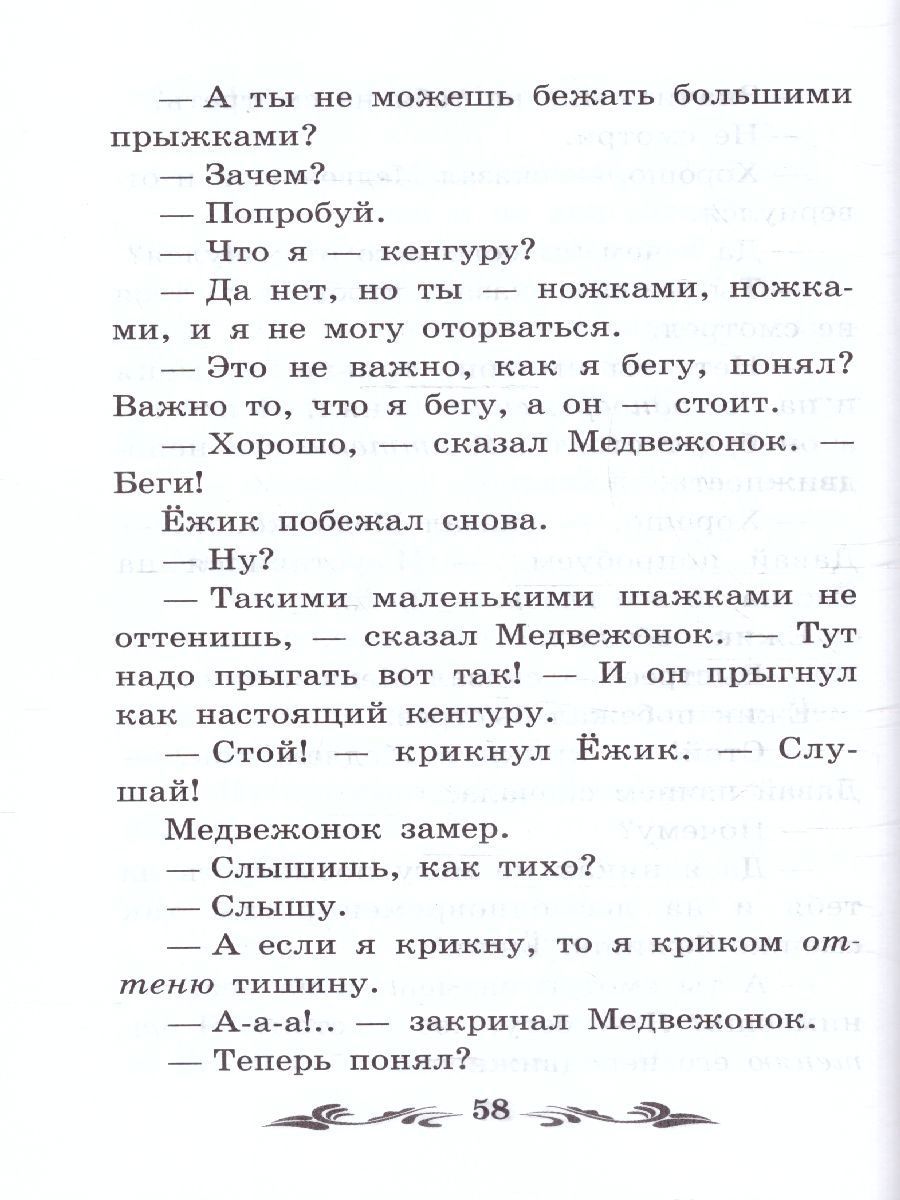 Замечательный сказочник Сергей Козлов придумал очень забавных и трогательных героев. Ёжик и Медвежонок - настоящие неразлучные друзья. Они ходят друг к другу в гости, вместе сумерничают, читают стихи великих поэтов. Ёжик любит протирать звёзды, чтобы они не потускнели, а Медвежонок водит знакомство с Солнечным зайцем и знает, как перехитрить время. Можно долго рассказывать про приключения этих героев, но лучше прочитать книгу и посмотреть мультфильм "Ёжик в тумане".Характеристики
