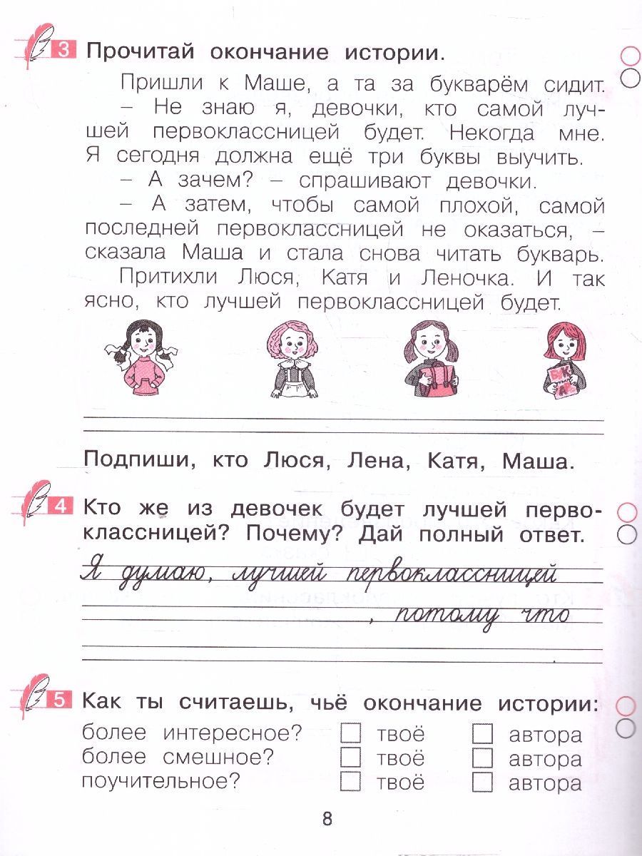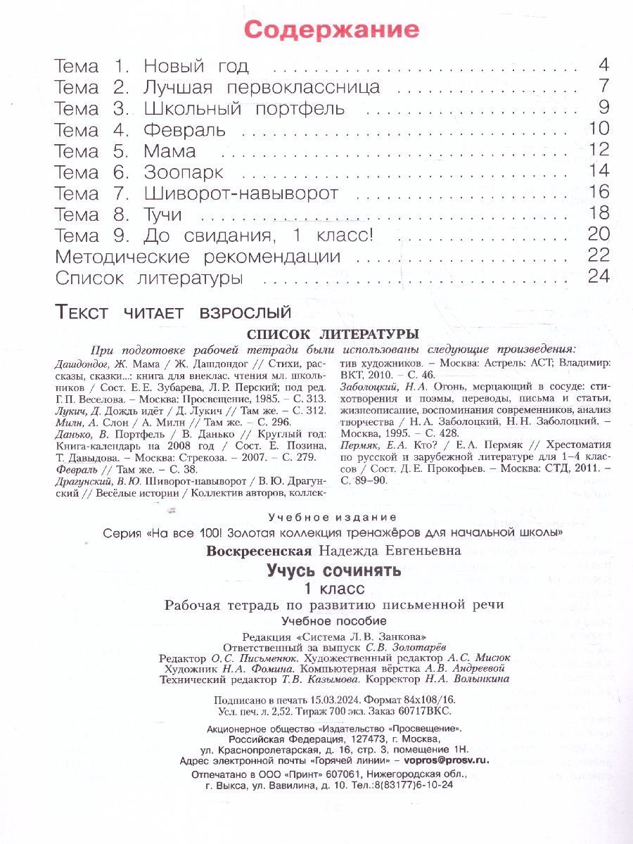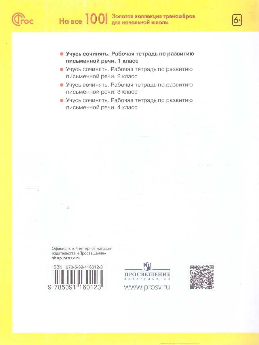 Учусь сочинять 1 класс. Рабочая тетрадь по развитию письменной речи. Рабочие тетради «Учусь сочинять» для 1-4 классов нацелены на формирование связной речи младших школьников: учат понимать слова, предложения, связи между ними, смысл текс та, законы его построения, передавать содержание текста и составлять свой собственный. Задания пособий способствуют повышению уровня читательской грамотности, развитию воображения и творческой самореализации обучающихся. Тетрадь позволяет ребёнку легко и с увлечением обогащать свою речь, знакомиться с функциональными стилями, с типами текста и простыми жанрами. Материал пособия имеет воспитательный потенциал. Тетради помогают оценить уровень развития речи ребёнка, увидеть динамику этого развития, результативность обучения и выявить возможные причины трудностей в освоении связной речи, сформировать навыки самоконтроля и самопроверки.Характеристики