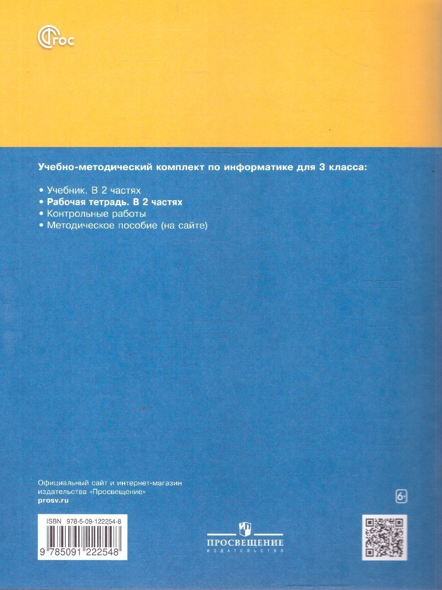 Рабочая тетрадь для 3 класса (в двух частях) входит в состав УМК по информатике для начальной школы (2–4). УМК для 3 класса также включает учебник в печатном и электронном виде, тетрадь контрольных работ, методическое пособие для учителя. УМК для 3 класса обеспечивает пропедевтическое обучение информатике, цель которого — сформировать представление учащихся об основных понятиях информатики на основе их личного опыта и знаний, полученных при изучении других школьных дисциплин, а также развить начальные навыки работы на персональном компьютере. Соответствует Федеральному государственному образовательному стандарту начального общего образования и Федеральной образовательной программе начального общего образования.Характеристики