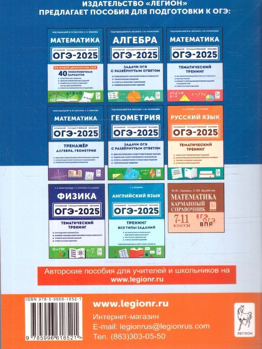ОГЭ-2025. Математика. 9 класс. Практико-ориентированные задания 1-5. Наше пособие поможет учащимся 9-х классов подготовиться к выполнению практико-ориентированных заданий, объединённых общим текстом, на основании которого выполняются задания 1−5 ОГЭ по математике. Книга содержит: 33 задачи с подробным решением; 32 задачи для самостоятельного решения; 4 образца выполнения заданий 1−5 в формате ОГЭ по математике; 4 итоговые работы в формате ОГЭ; ответы ко всем заданиям и вариантам. Пособие предназначено учащимся 9-x классов, а также учителям, осуществляющим подготовку к ОГЭ.Характеристики