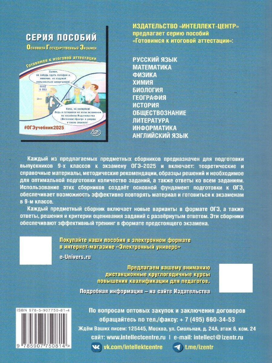 огэ 2025 обществознание. готовимся к итоговой аттестации. фгос. данное пособие предназначено для подготовки учащихся 9 классов к государственной итоговой аттестации – основному государственному экзамену (огэ) по обществознанию. издание включает типовые задания по всем содержательным линиям экзаменационной работы, а также примерные варианты в формате огэ 2025 года. пособие поможет школьникам проверить свои знания и умения по предмету, а учителям – оценить степень достижения требований образовательных стандартов отдельными учащимися и обеспечить их целенаправленную подготовку к экзамену. |