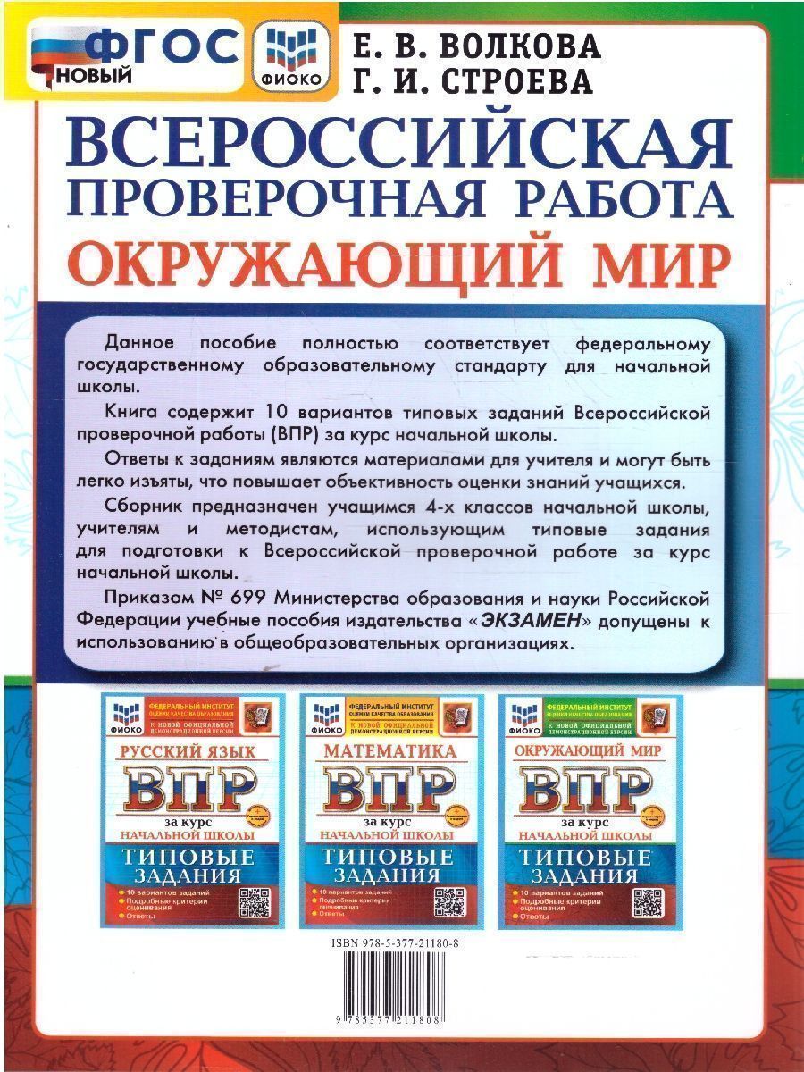 ВПР Окружающий мир за курс начальной школы. Типовые задания. 10 вариантов. ФИОКО. ФГОС НОВЫЙ (по 10 заданий в каждом варианте). Данное пособие полностью соответствует федеральному государственному образовательному стандарту для начальной школы. Книга содержит 10 вариантов типовых заданий Всероссийской проверочной работы (ВПР) за курс начальной школы. Ответы к заданиям являются материалами для учителя, они могут быть легко изъяты, что повышает объективность оценки знаний учащихся. Сборник предназначен учащимся 4-х классов начальной школы, учителям и методистам, использующим типовые задания для подготовки к Всероссийской проверочной работе за курс начальной школы.Характеристики