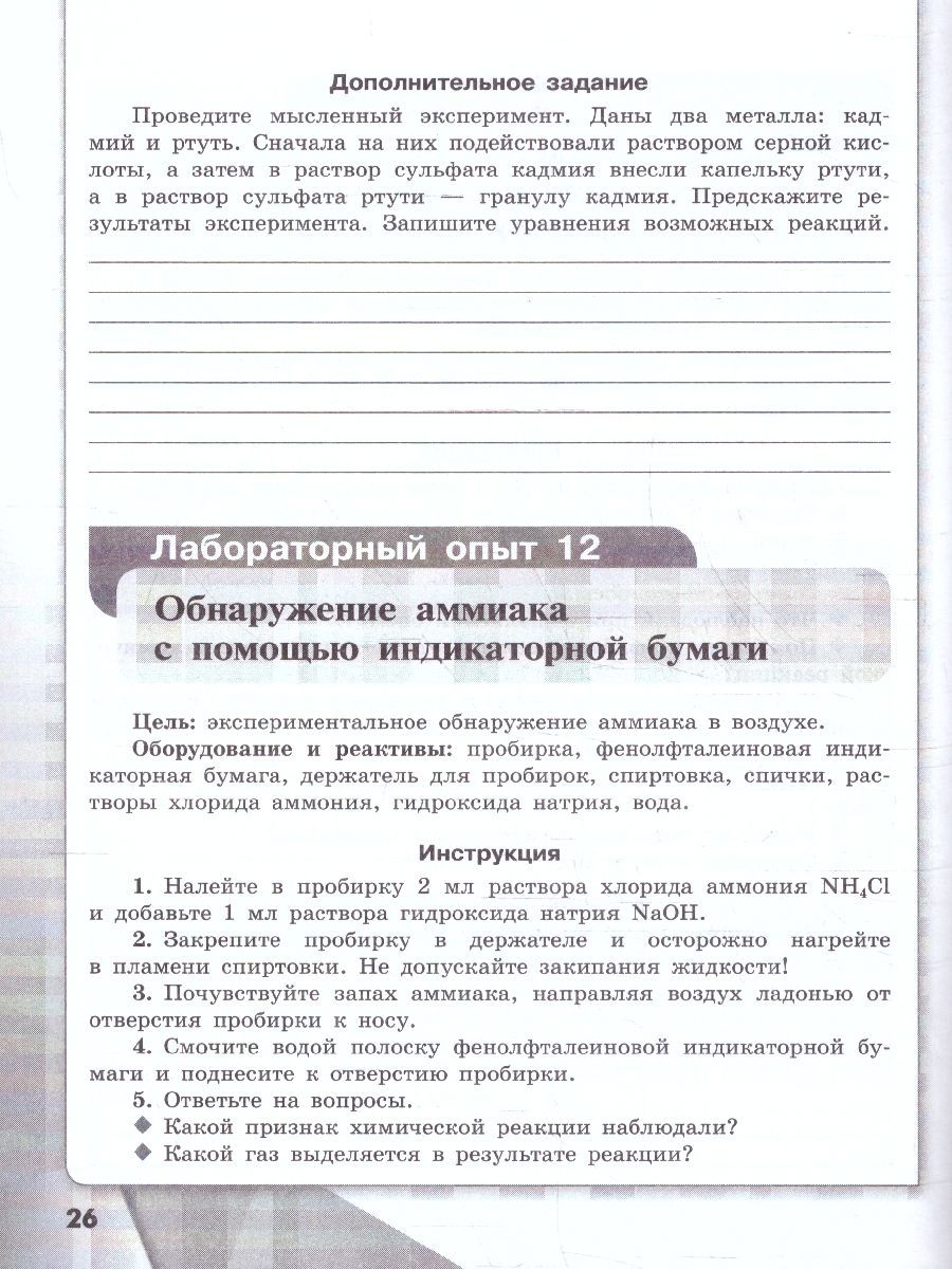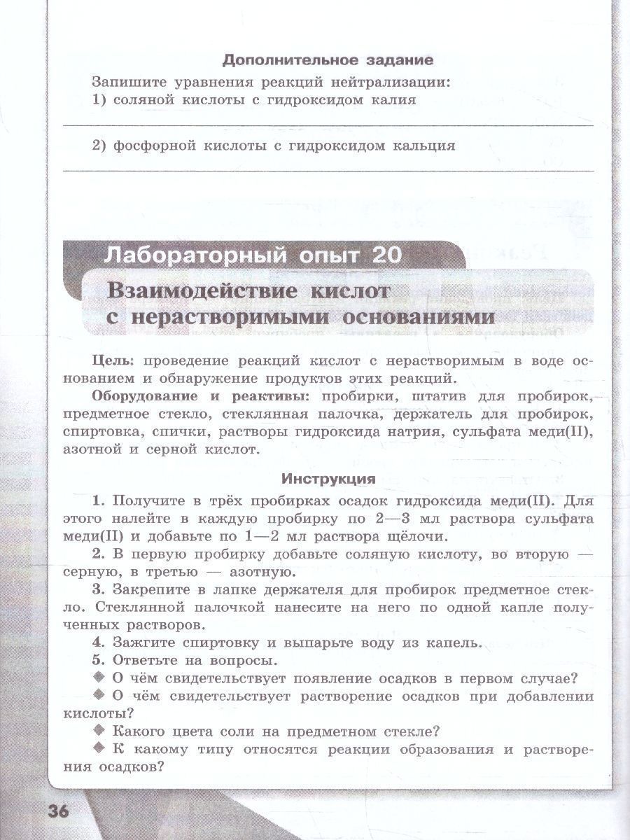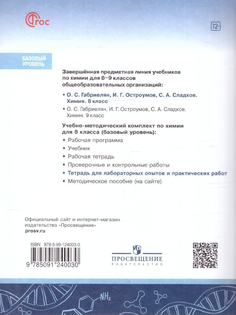 Химия 8 класс. Базовый уровень. Тетрадь для лабораторных опытов и практических работ. ФГОС. Тетрадь для лабораторных опытов и практических работ создана к учебнику химии для 8 класса общеобразовательных организаций авторов О.С. Габриеляна, И.Г. Остроумова, С.А. Сладкова и по структуре полностью ему соответствует. Тетрадь состоит из трёх частей: правила техники безопасности, лабораторные опыты и практические работы. Тетрадь поможет сформировать и закрепить навыки работы с химическим оборудованием в процессе выполнения эксперимента.Характеристики
