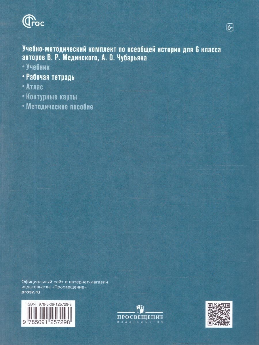 Всеобщая история 6 класс. История Средних веков. Рабочая тетрадь к гос. учебнику. Рабочая тетрадь является дополнением к учебнику «История. Всеобщая история. История Средних веков. 6 класс» авторов Мединского В. Р., Чубарьяна А. О., разработанному в соответствии с Федеральным государственным образовательным стандартом основного общего образования основным и Федеральной образовательной программой основного общего образования. Тетрадь предназначена для контроля знаний учащихся и закрепления учебного материала, представленного в учебнике. Она содержит разнообразные задания, направленные на работу с хронологией, историческими понятиями и терминами, источниками информации, а также задания по работе с картами.Характеристики