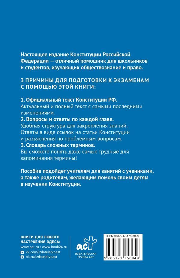 Настоящее издание Конституции Российской Федерации — отличный помощник для школьников и студентов, изучающих обществознание и право. Три причины для подготовки к занятиям и экзаменам с помощью этой книги: 1. Официальный текст Конституции РФ. Актуальный и полный текст с самыми последними изменениями. 2. Вопросы и ответы по каждой главе. Удобная структура для закрепления знаний. Ответы в виде ссылок на статьи Конституции и разъяснения по проблемным вопросам. 3. Словарь сложных терминов. Вы сможете понять даже самые трудные для запоминания термины! Пособие подойдет учителям для занятий с учениками, а также родителям, желающим помочь своим детям в изучении Конституции.Характеристики