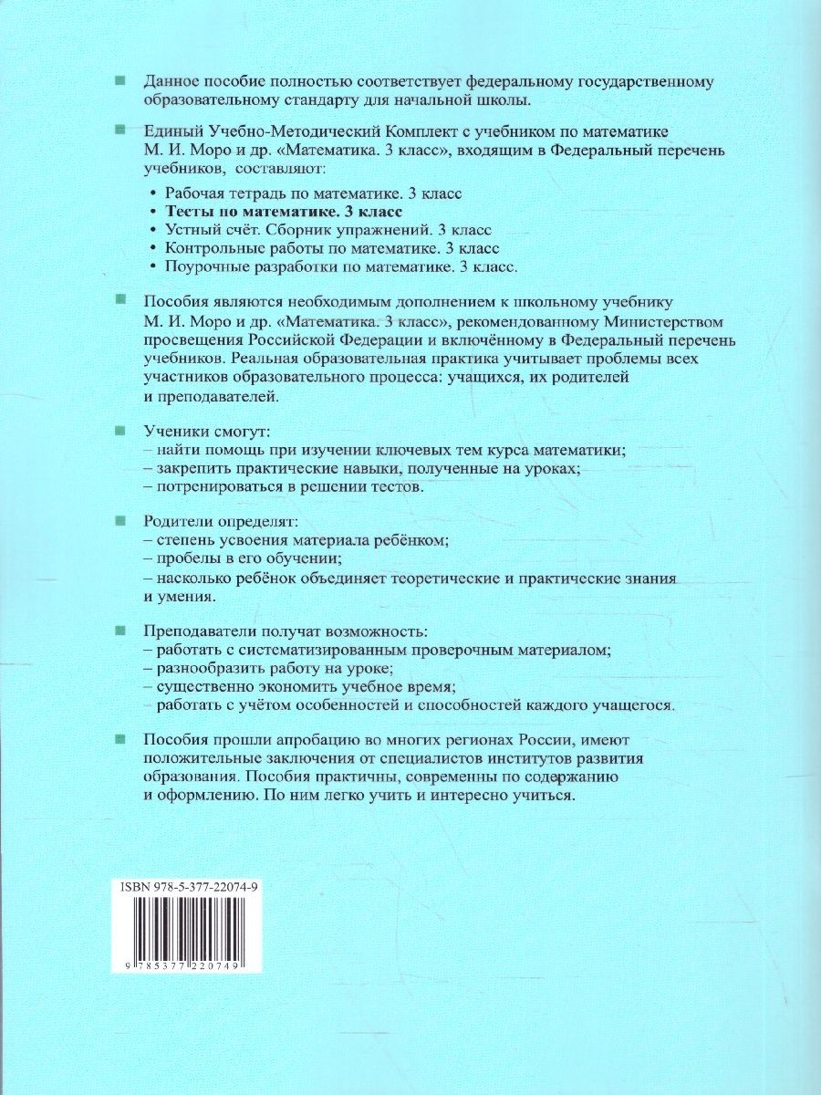 Математика 3 класс. Тесты. К учебнику М. И. Моро и др. Часть 2. ФГОС Новый. Данное пособие полностью соответствует федеральному государственному образовательному стандарту для начальной школы. Данный сборник с тестами предназначен для тематического и итогового контроля знаний учащихся по основным разделам учебника "Математика. 3 класс. В 2-х частях" (авт. М. И. Моро и др.). Он может быть использован учителями, работающими и по другим комплектам, так как основные темы курсов совпадают. Тесты помогут учащимся в изучении основных тем курса математики, а учителю предоставят систематизированный проверочный материал.Характеристики