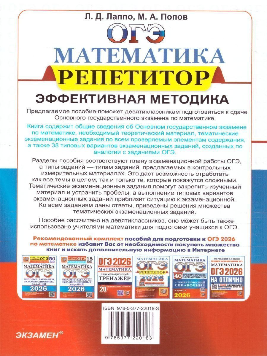 ОГЭ 2026 Математика. Репетитор. 38 типовых заданий. Предлагаемое пособие поможет девятиклассникам подготовиться к сдаче Основного государственного экзамена по математике. Разделы пособий соответствуют плану экзаменационной работы ОГЭ, типичным заданиям - типам заданий, предлагаемых в контрольных измерительных материалах. Это даст возможность отработать как все темы в целом, так и только те, которые покажутся встроенными. Тематические экзаменационные задания помогают закрепить изученный материал и устранить пробелы, а выполнение типовых вариантов экзаменационных заданий соответствует состоянию экзаменационной. Ко всем заданиям даны ответы, приведены решения по тематическим экзаменационным заданиям. Кроме того, расчет для девятиклассников может быть также использован учителями математики для подготовки учащихся к ОГЭ.Характеристики
