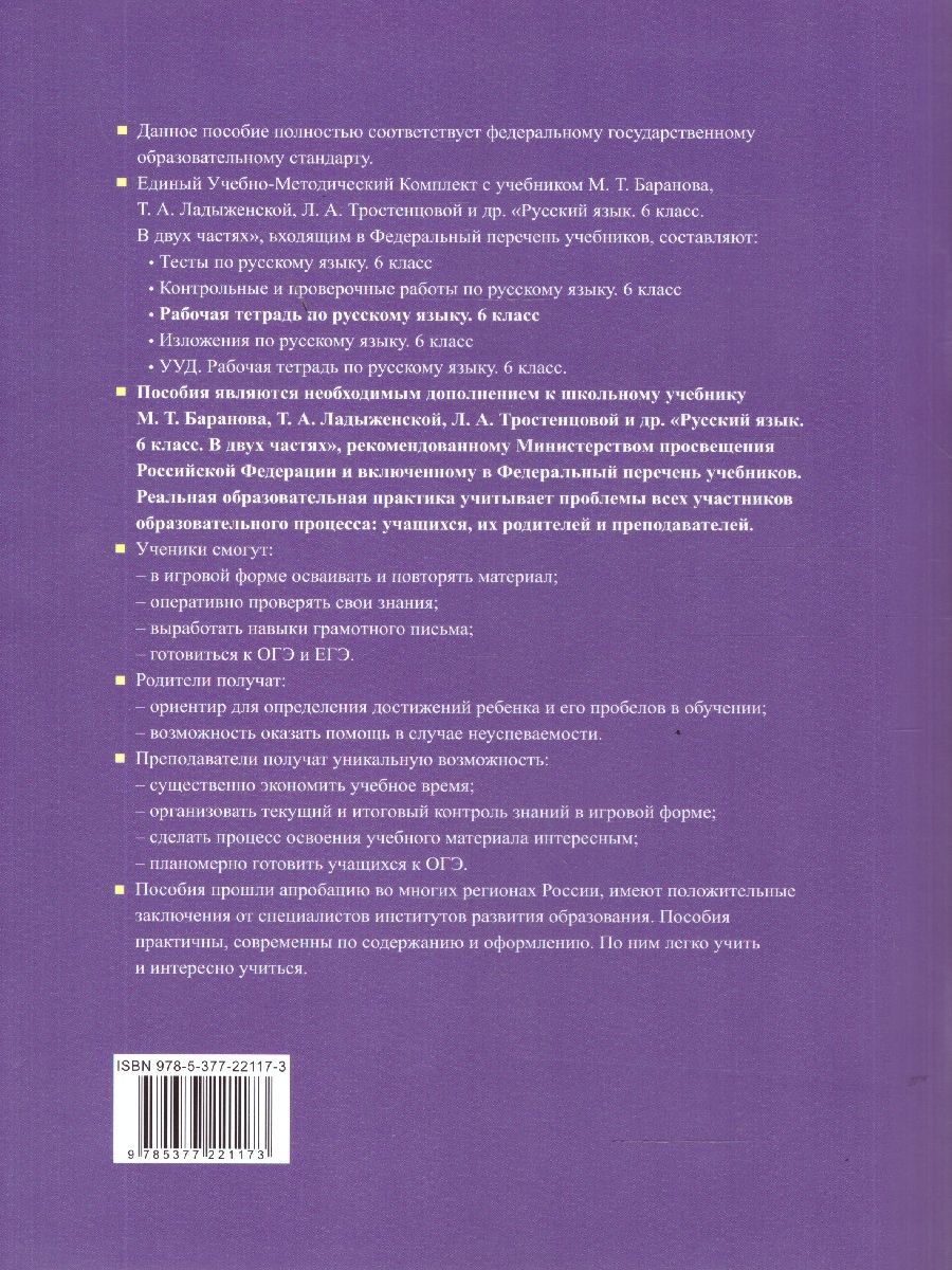 Русский язык 6 класс. Рабочая тетрадь. Часть 2. ФГОС Новый. Настоящее пособие полностью соответствует федеральному государственному образовательному стандарту. В рабочей тетради содержатся задания к каждому разделу учебника, выполняя которые ученики могут глубже осмыслить теоретический материал, анализ материала с заложенными в учебнике правилами, научиться применять эти правила на практике, а значит, повысить свою грамотность. В тетрадь включены тексты лучших мастеров слов русской литературы, которые позволяют шестикласснику видеть и понимать красоту художественного текста, выявить выразительность собственной письменной речи. Издание рассчитано на преподавателей русского языка, методистов, учащихся.Характеристики