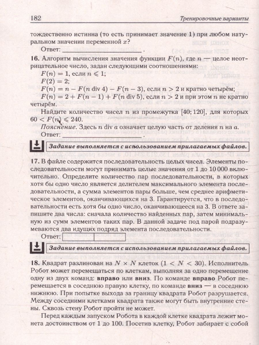 ЕГЭ-2026 Информатика. Подготовка к ЕГЭ. 20 тренировочных вариантов. -Учебное пособие предназначено для качественной подготовки к ЕГЭ по информатике в 2026 году. Книга содержит: -20 тренировочных вариантов, составленных в соответствии с проектами демоверсии и спецификации ЕГЭ 2026 года по информатике, опубликованными на сайте ФИПИ 22.08.2025 г.; -вариант с комментариями; -ответы ко всем вариантам. -Файлы для выполнения заданий 3, 9, 10, 17, 18, 22, 24, 26, 27 размещены на сайте издательства. Книга адресована выпускникам общеобразовательных учреждений, а также учителям, которые могут использовать приведённые в ней материалы в процессе подготовки учащихся к ЕГЭ.Характеристики