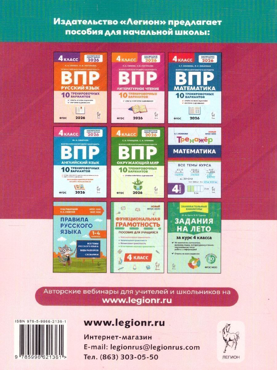 ВПР 2026 Русский язык, математика, окружающий мир, литературное чтение 4 класс. 20 вариантов. ФГОС Новый. Пособие предназначено для подготовки к ВПР в 4-м классе. Работа с нашей книгой поможет выпускникам начальной школы написать ВПР на высокий балл. Пособие содержит: - 20 вариантов в формате ВПР: по каждому предмету предлагаются 5 вариантов; - инструкции для школьников; - ответы ко всем заданиям и критерии оценивания. Задания соответствуют описаниям и образцам проверочных работ, опубликованным ФИОКО. Все варианты единообразно структурированы и имеют одинаковый уровень сложности. Пособие адресовано четвероклассникам, их родителям и учителям.Характеристики