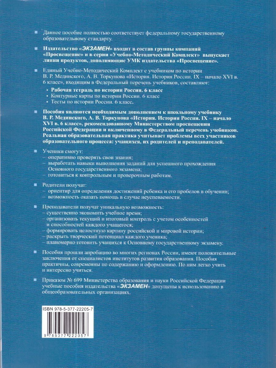 История России. IX - начало XVI в. Рабочая тетрадь к учебнику В. Р. Мединского. Данное пособие полностью соответствует федеральному государственному образовательному стандарту. Рабочая тетрадь соответствует содержанию и структуре учебника В. Р. Мединского, А. В. Торкунова по истории России для 6-го класса. В неё включены разнообразные по форме и уровню сложности задания, выполняя которые учащиеся повторяют и углубляют полученные на уроке знания, закрепляют и совершенствуют необходимые умения и навыки. Контурные карты и задания к ним помогут учащимся сформировать навыки работы с историческим атласом и картами учебника. С тетрадью можно работать как на уроке, так и дома. Рабочая тетрадь предназначена учащимся 6-х классов, учителям и методистам.Характеристики