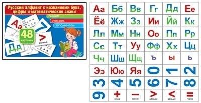Русский алфавит с названиями букв, цифры и математические знаки. Учебно-игровой комплект. Комплект карточек